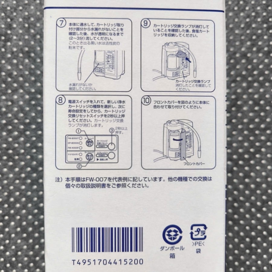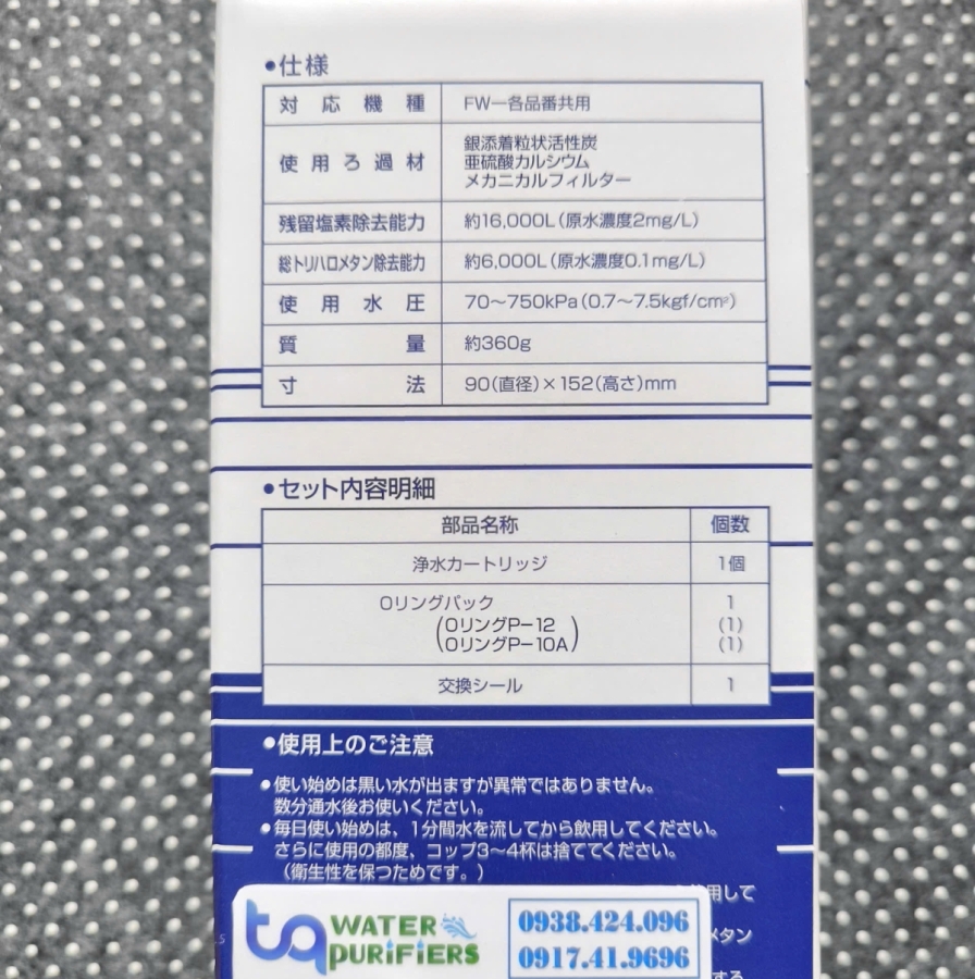 Hướng dẫn về thời gian thay thế là khoảng một năm khi sử dụng 40L một ngày. Các model áp dụng là FW-7000, FW-007, FW-005, FW-1000, FW-3500, FW-4000, FW-4100, FW-4500, FW-4700, FW-5000, FW-5500, FW-5600., FW-6500, FW-107.
