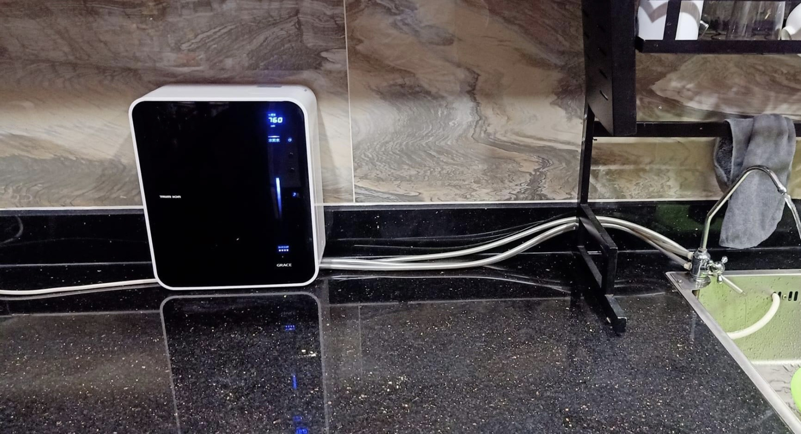 So với thiết kế của các model máy lọc nước điện giải ion kiềm Trim Ion trước đó, sản phẩm Trim Ion Grace đã được thay đổi diện mạo hiện đại và sang trọng hơn. Ấn tượng với thiết kế mặt kính màu đen mạnh mẽ, giúp không gian sống thêm sang trọng, có màn hình LCD trực quan dễ theo dõi thông tin như mức pH, nồng độ hydro hòa tan nước ion kiềm… Vì bảng điều khiển cảm ứng và kèm âm thanh báo động lẫn đèn tín hiệu nên người dùng dễ dàng sử dụng, chỉ với một cái chạm nhẹ là có thể lấy được loại nước theo nhu cầu.