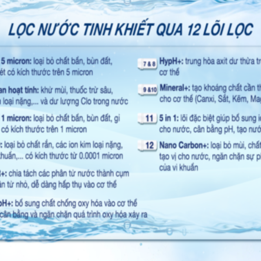 - Lõi 9 và lõi 10 Mineral+ (Sx Việt Nam): tạo khoáng chất cần thiết cho cơ thể (Canxi, Sắt, Kẽm, Magie,…).