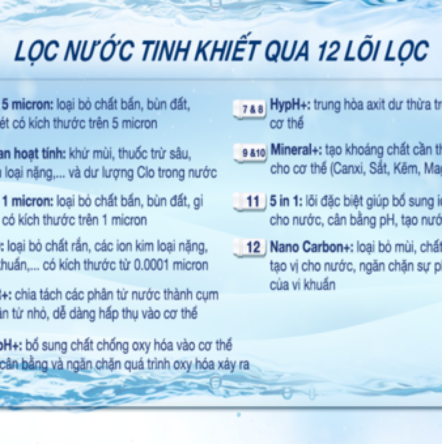 - Lõi Nano Carbon+ (Sx Việt Nam): loại bỏ mùi, chất Flo, tạo vị cho nước, ngăn chặn sự phát triển của vi khuẩn.